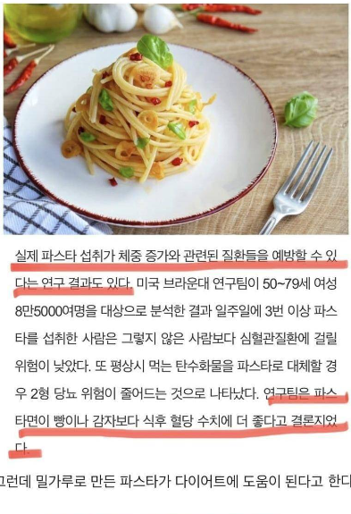 강 교수는 "파스타 역시 고탄수화물 식품이므로 많이 섭취하면 살이 찔 수 있다"면서 "파스타만으로는 영양 균형을 맞출 수 없으므로 채소, 해산물, 육류, 올리브오일 등을 넣어 먹으면 건강한 한 끼가 될 수 있다"고 조언했다.